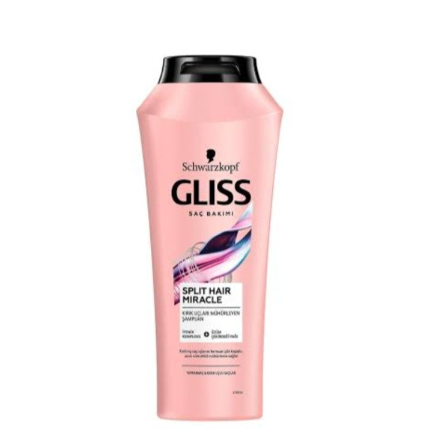 شامپو ضد موخوره و ترمیمکننده نوک مو گلیس اسپلیت هیر میراکل (رنگ صورتی روشن) از برند Schwarzkopf آلمان، مخصوص موهایی که نوکشان دوشاخه شده، موخوره شدید دارد یا به دلیل رنگ، حرارت و شانهزدن زیاد آسیب دیده است.