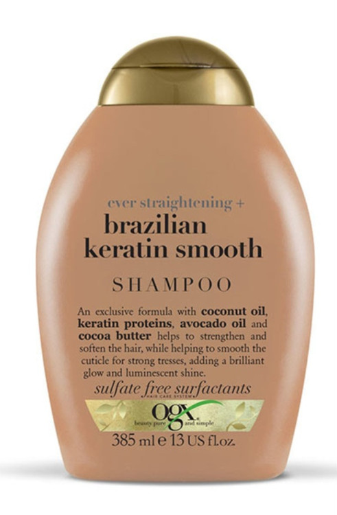 شامپو کراتین برزیلی OGX با فرمولاسیون لوکس و غنیشده با کراتین برزیلی، روغن نارگیل، روغن آووکادو و کره کاکائو، مخصوص موهای وز، مجعد، فر و موهایی که میخوان صاف و لخت بشن طراحی شده.